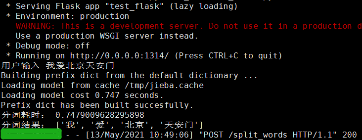 说明:我们定义了一个get_result()函数,对应的请求是ip:port/split_words。 首先我们根据请求是get请求还是post请求获取数据,然后使用模型根据输入数据得到输出结果,并返回响应给请求。如果遇到异常,则进行相应的处理后并返回。在__main__中,我们引入了model.py的jiebamodel类,然后加载了模型,并在get_result()中调用。