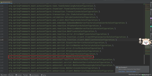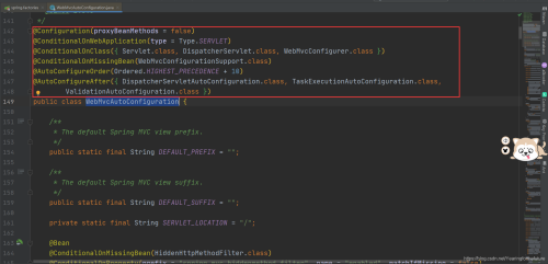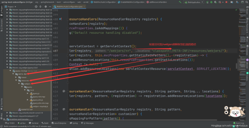 我们学完之前的框架,大概知道静态资源过滤是由mvc处理的,然后在分析自动装配的时候会遇到webmvcautoconfiguration类,我们点击进入该类,如图所示: