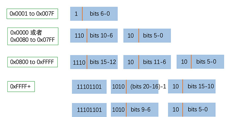 从上图可以看到,不同的unicode范围使用的是不同的编码方式。