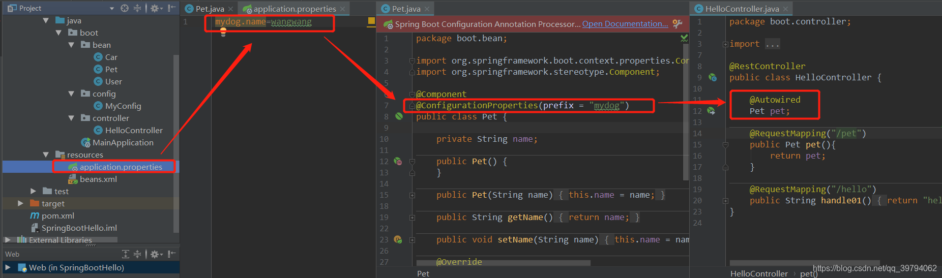 需要使用@configurationproperties 和 @component两个注解,@component注解将组件注册到容器中,因为只有在容器中的组件,才能使用springboot提供的一些强大的注解功能