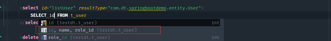 我们先输入第一个字段,id,然后就会有提示,点击你需要的实体,即可全部生成全部字段。