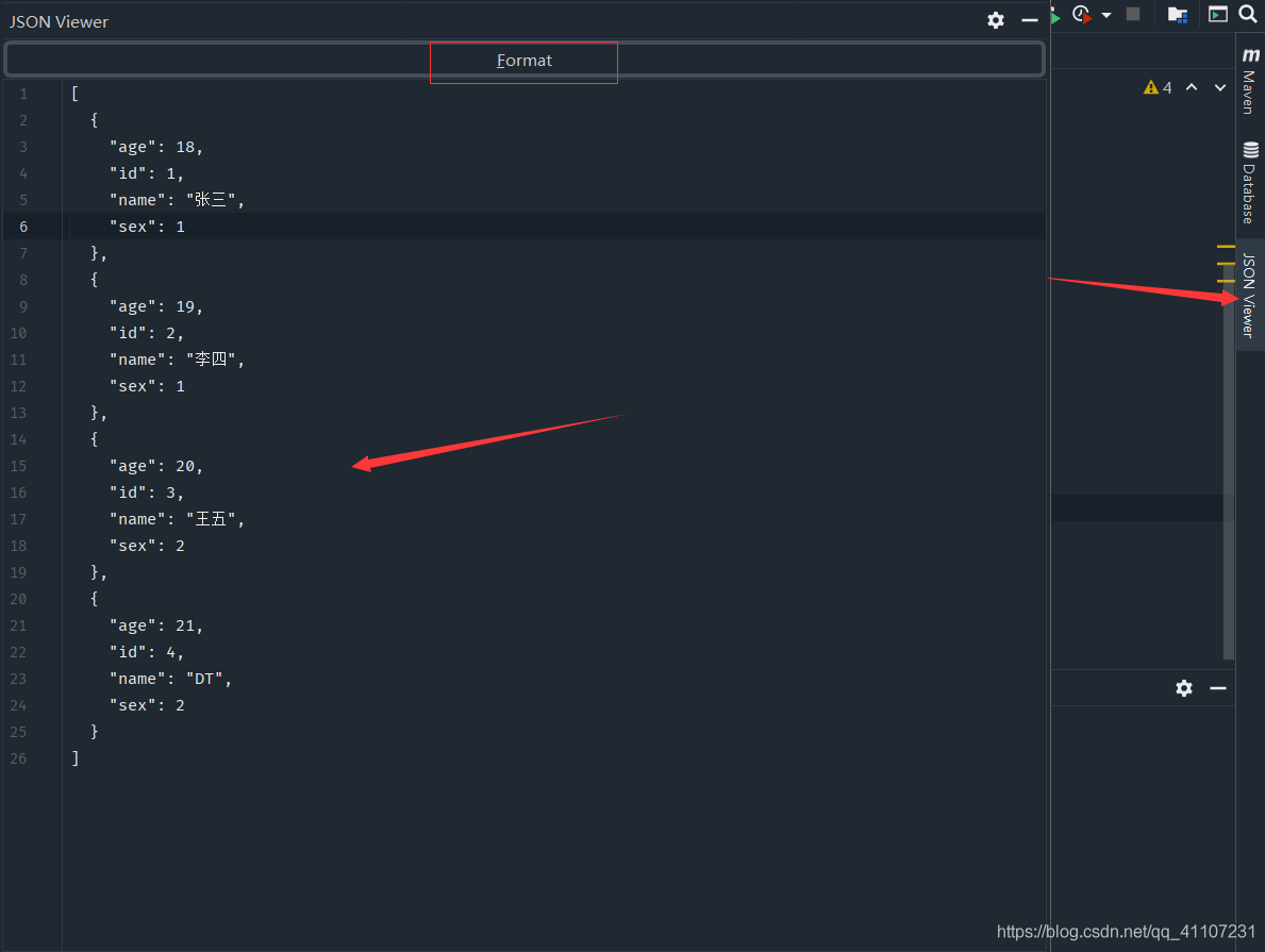 [{"age":18,"id":1,"name":"张三","sex":1},{"age":19,"id":2,"name":"李四","sex":1},{"age":20,"id":3,"name":"王五","sex":2},{"age":21,"id":4,"name":"dt","sex":2}]