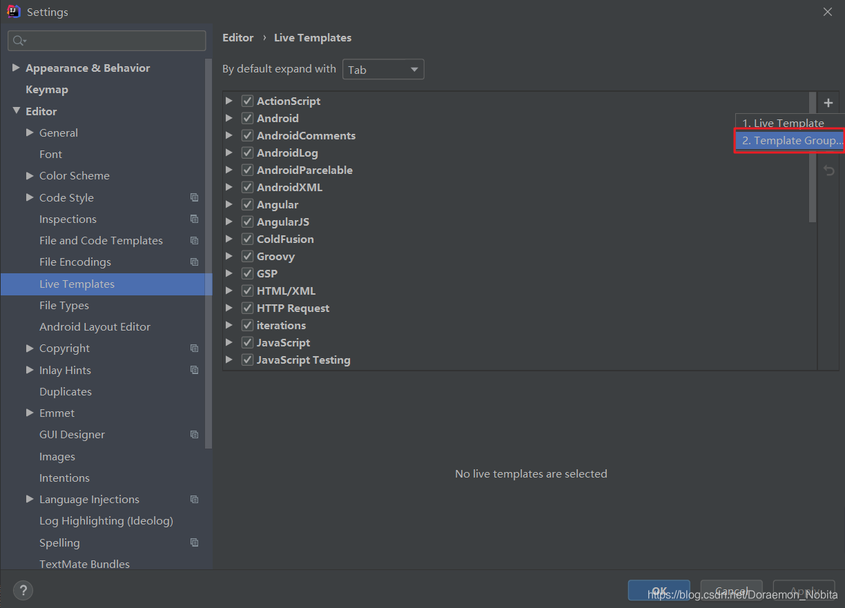 打开idea的settings-editor-live templates。点击右边的+号。选择template group。