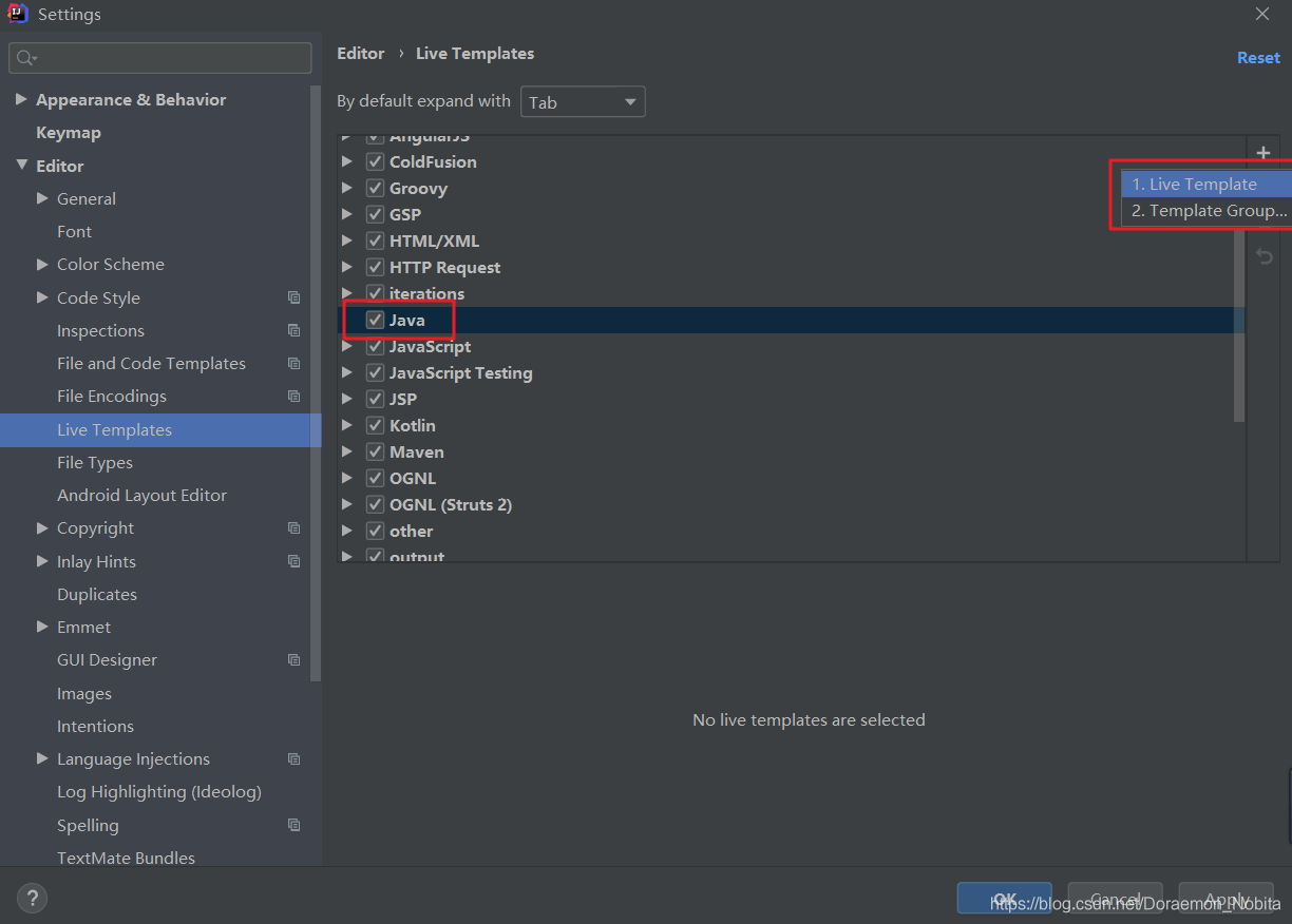 这里我用的java作为template group名,然后在选中刚刚创建的template group,再点击右边的+号,这次选live template。
