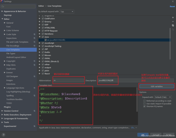 界面中abbreviation是我们要识别的快捷键,这里我填了个m,description是对该快捷键的描述。template text则是我们希望使用该快捷键自动生成的代码。如果我们的template text里面包含了变量,则可以点击edit variables设置具体的变量值。expand with我们选默认的tab。