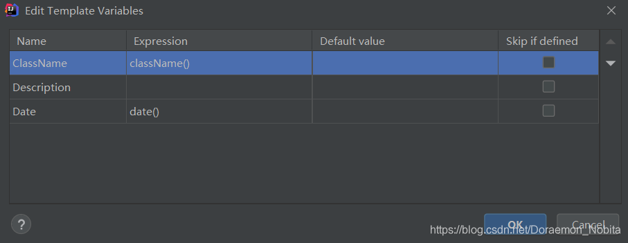 点击edit variables。可以看到我们在template text中的三个变量我们可以设置其表达式和默认值,这里设置好类名和时间。