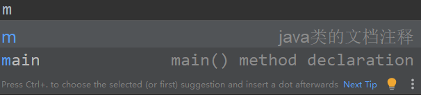 然后我们回到我们的java文件中,输入m可以看到idea自动就提示了这个信息,我们可以直接回车,也可以在m后输入tab来自动生成我们的模板代码。