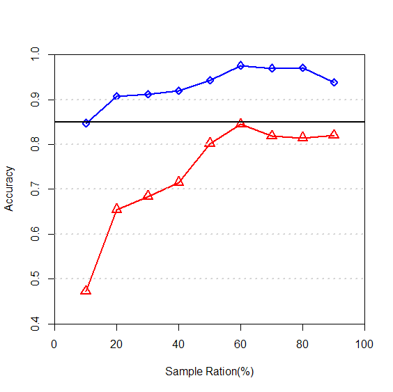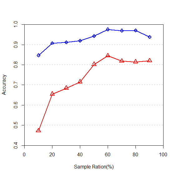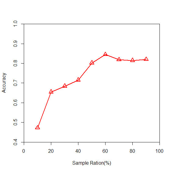 xlab="sample ration(%)",ylab="accuracy")