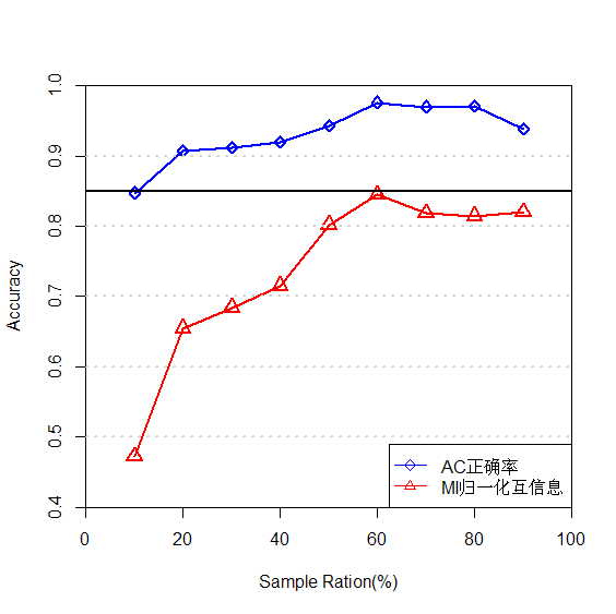 legend("bottomright",legend=c("ac正确率","mi归一化互信息"),col=c("blue","red"),pch=c(5,24),lty=1)