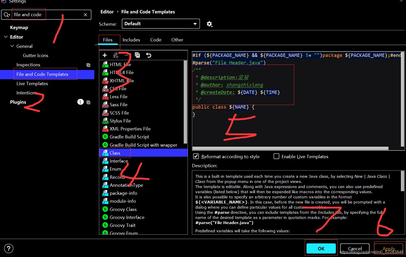 2.按照下图的步骤:直接搜索file and code–>导航栏点击file and code templates–>点击files文件类型–>然后选择class文件模板在里面编辑自己想要的模板–>点击apply应用一下–>点击ok.如果还要设置方法模板的话先别急着点ok。