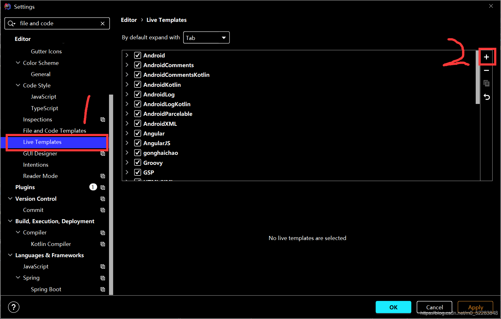 1.搜索file and code–>点击下面的live template 或者直接搜索live template;–>然后点击右边的小加号