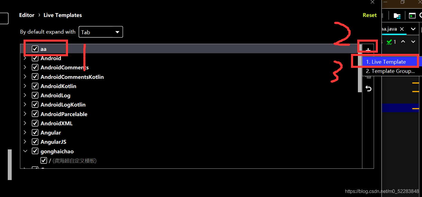 4.找到并选中自己创建的模板–》点击右边的小加号然后选择live template