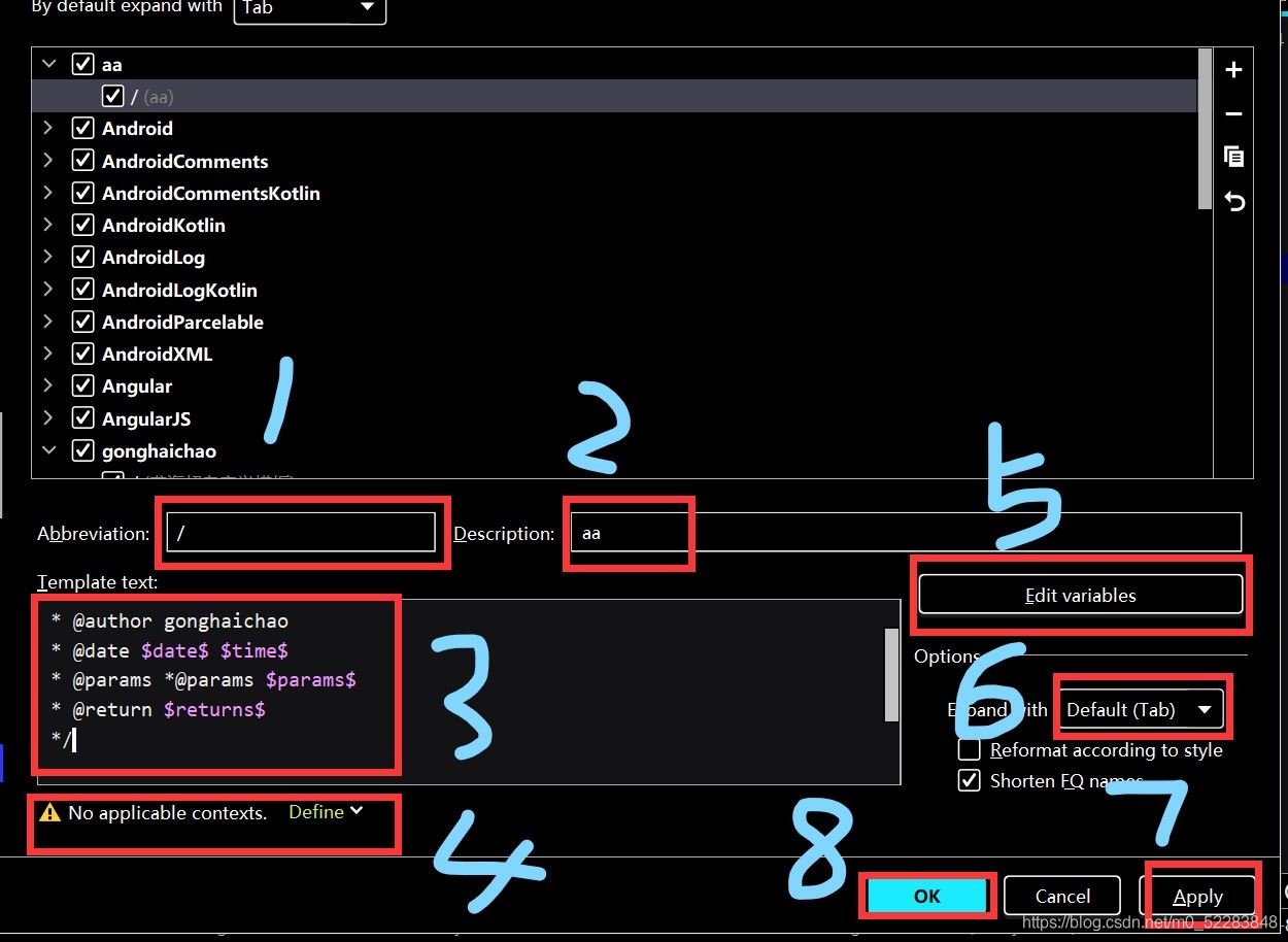 这里选择的是java–》点击expand with设置呼出快捷键;使用注解时通过abbreviation名字+设置的 快捷键呼出:例如这里是通过 /+tab键呼出注解。