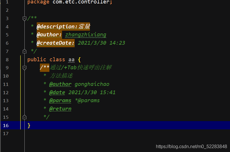 实际演示图:类注解创建类就自动出现,方法注解通过自己设置的快捷键呼出,这里是/+tab(模板名+tab)