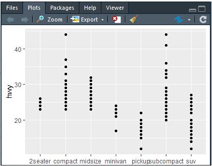 ggplot(data=mpg,mapping=aes(y=hwy,x=class))+ geom_point()
