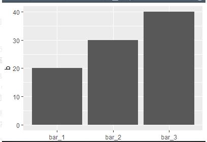 library(tibble) tri<-tribble( ~a,~b, "bar_1",20, "bar_2",30, "bar_3",40 ) #set a to x,set b to y #stat需要改为identity ggplot(data=tri)+ geom_bar(mapping = aes(x=a,y=b),stat = "identity")