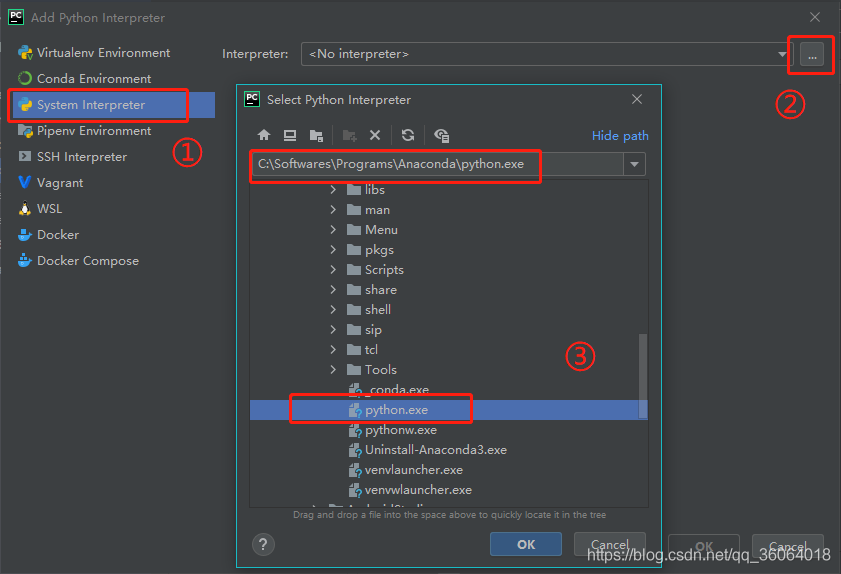 然后选择 system interpreter,选中自己安装的 python,点击两个窗口的ok