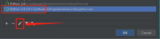 在弹出来的窗口中,我们选中新增的 python 解释器,点击图标为笔的按钮