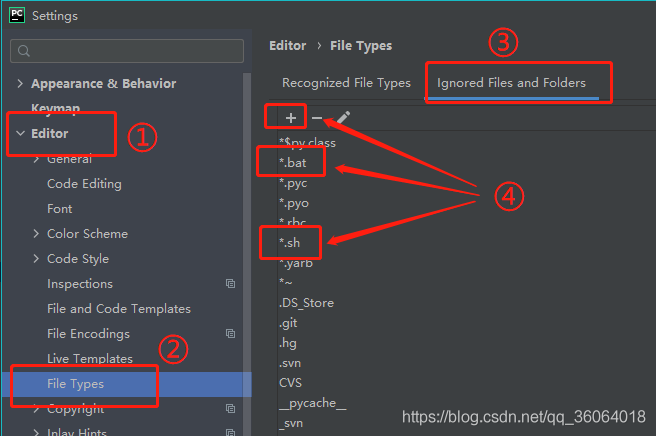 打开 settings,依次添加 *.bat 和 *.sh 到忽略列表中,点击ok,这样 pycharm 就不会显示 bat、sh 格式的文件了。