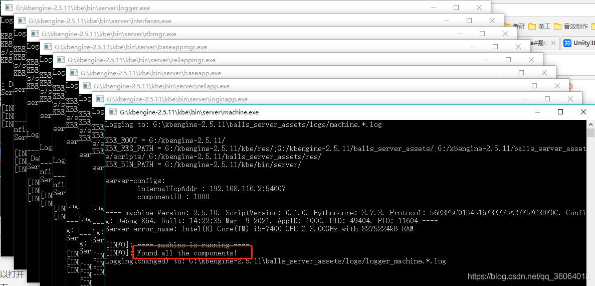 可以打开 kbengine 服务器的 9 个进程,也可以在 pycharm 的控制台中输出批处理文件的执行信息,如下