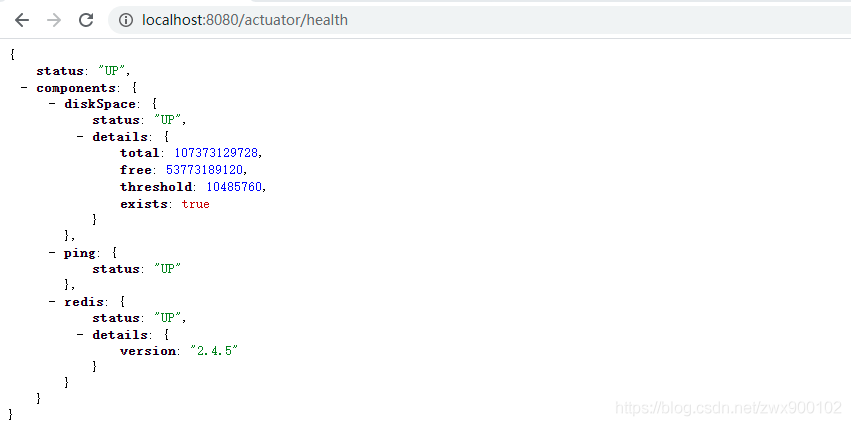 health 断点默认只是展示当前应用健康信息,但是我们可以通过另一个配置打开详细信息,这样不仅仅会监控当前应用,还会监控与当前应用相关的其他第三方应用,如 redis。