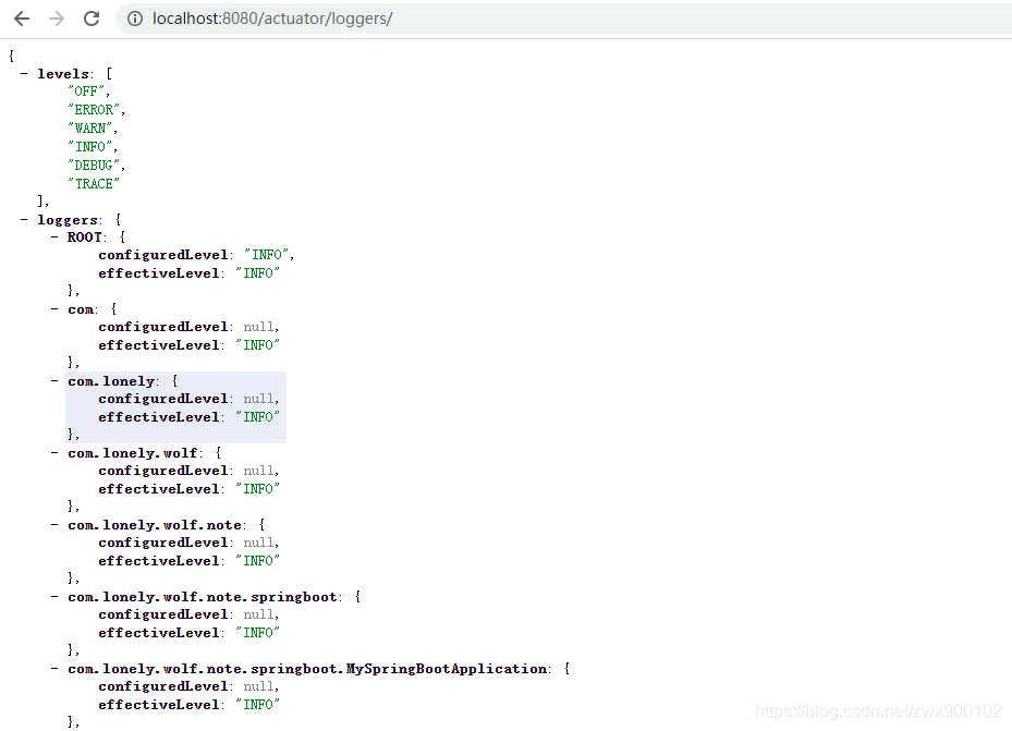 访问 http://localhost:8080/actuator/loggers 可以查看当前应用的日志级别等信息:
