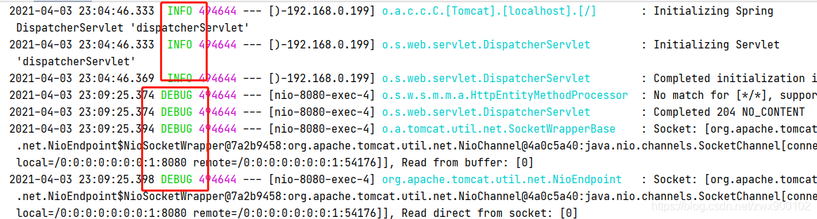 修改之后就会发现,日志由原来的 info 变成了 debug: