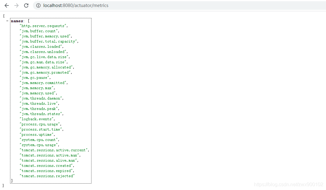 metrics 是一个非常重要的监控端点,其监控内容覆盖了 jvm 内存、堆、类加载、处理器和 tomcat 容器等一些重要指标: