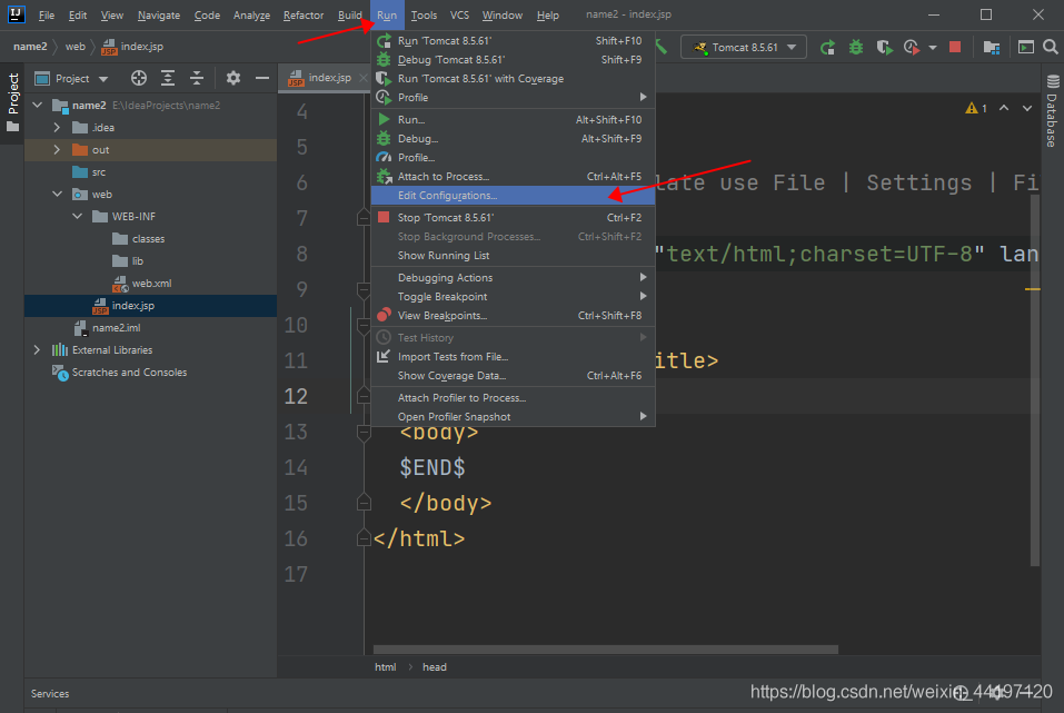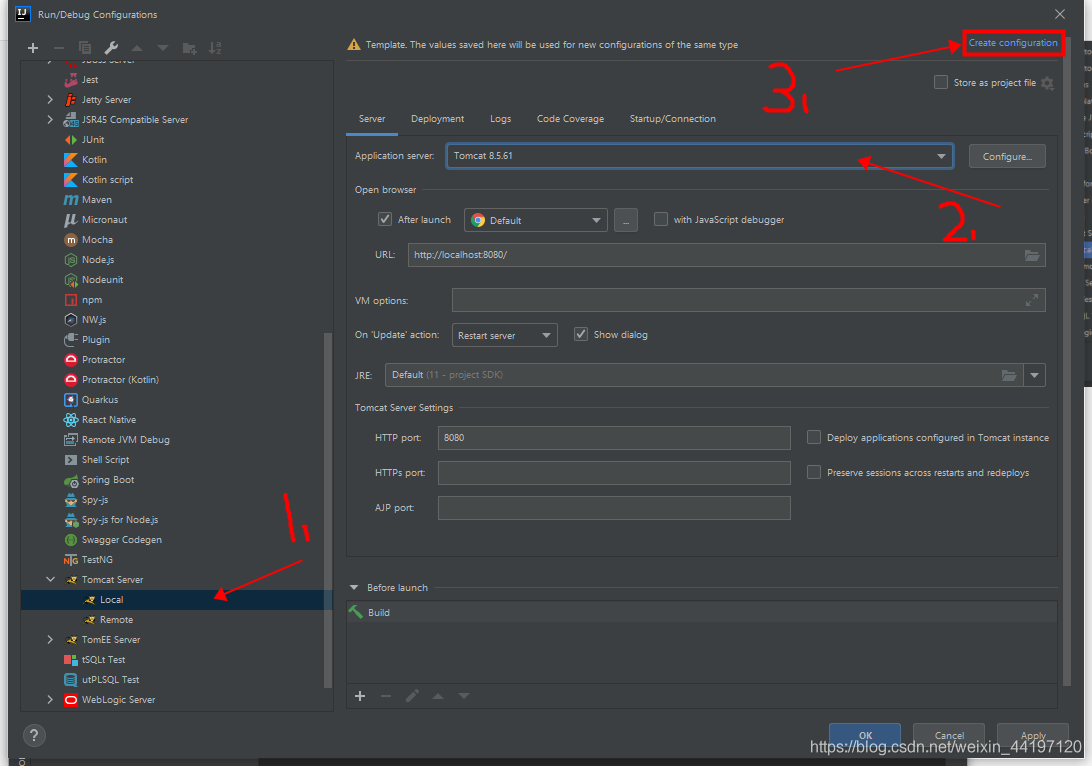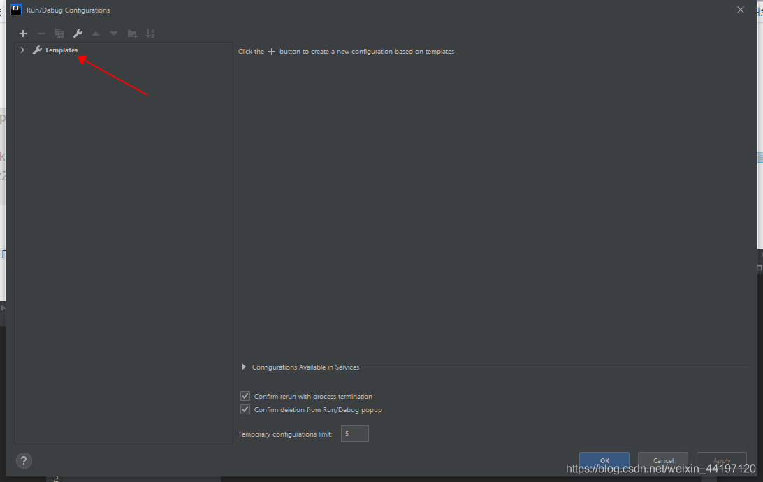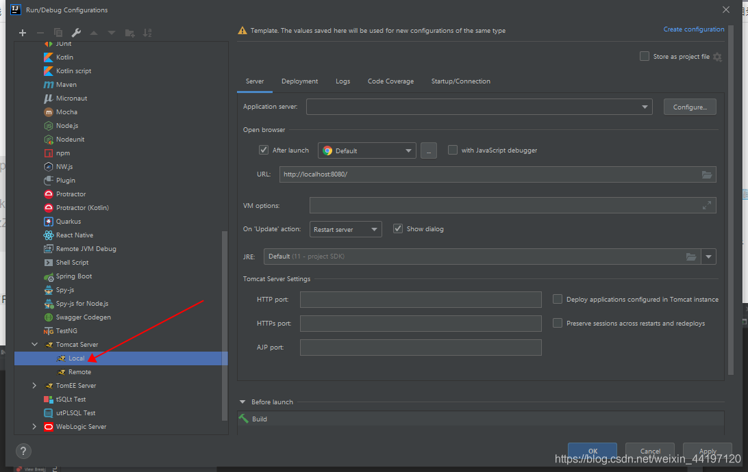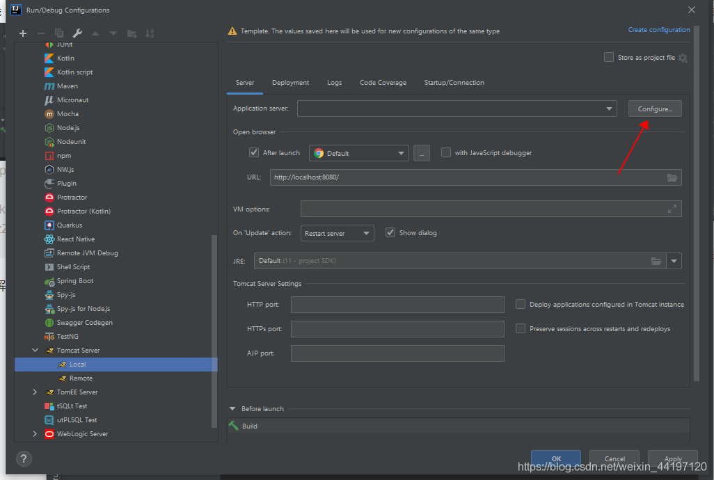 打开idea点击最上面的run,并且选择edit donfiguration...,点击templates,并且找到tomcat server,点击local