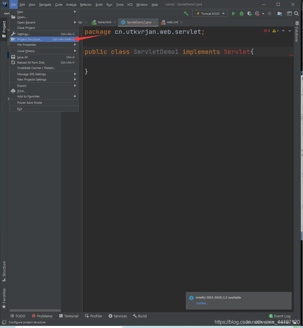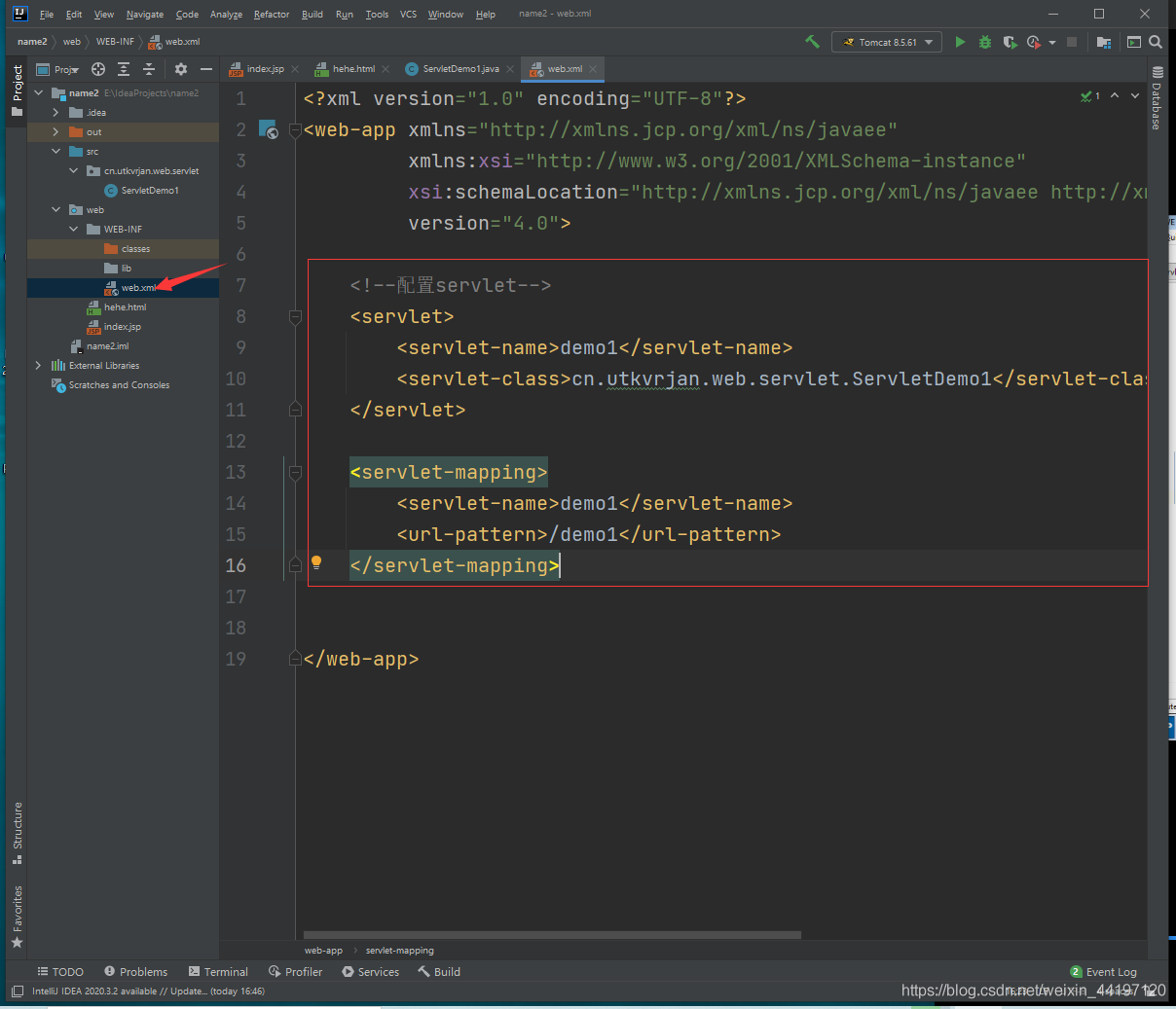 <!--配置servlet--> <servlet> <servlet-name>demo1</servlet-name> <servlet-class>cn.utkvrjan.web.servlet.servletdemo1</servlet-class> </servlet> <servlet-mapping> <servlet-name>demo1</servlet-name> <url-pattern>/demo</url-pattern> </servlet-mapping>