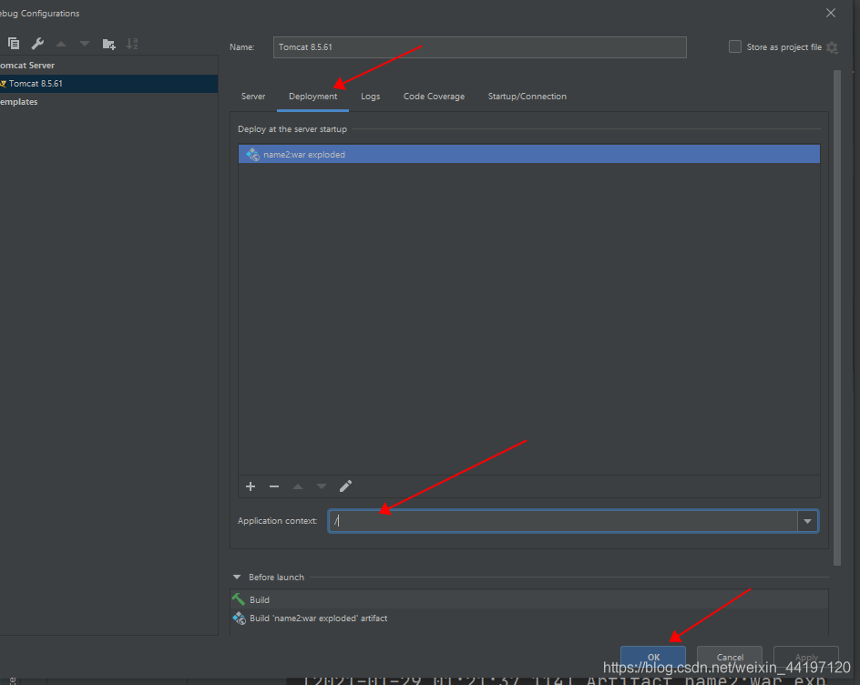 (习惯)把application context改成/(这里是设置虚拟目录,如果是/的话就是访问网站的时候不需要虚拟目录了,直接输入localhost:8080就能访问index.jsp)