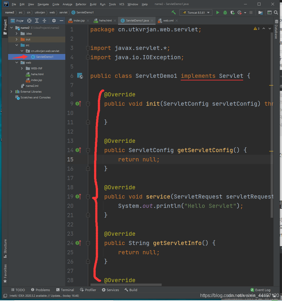 就可以在src下创建.java文件并且实现servlet接口并且实现它的5个方法,并在service方法下写一个输出代码,待会会用到