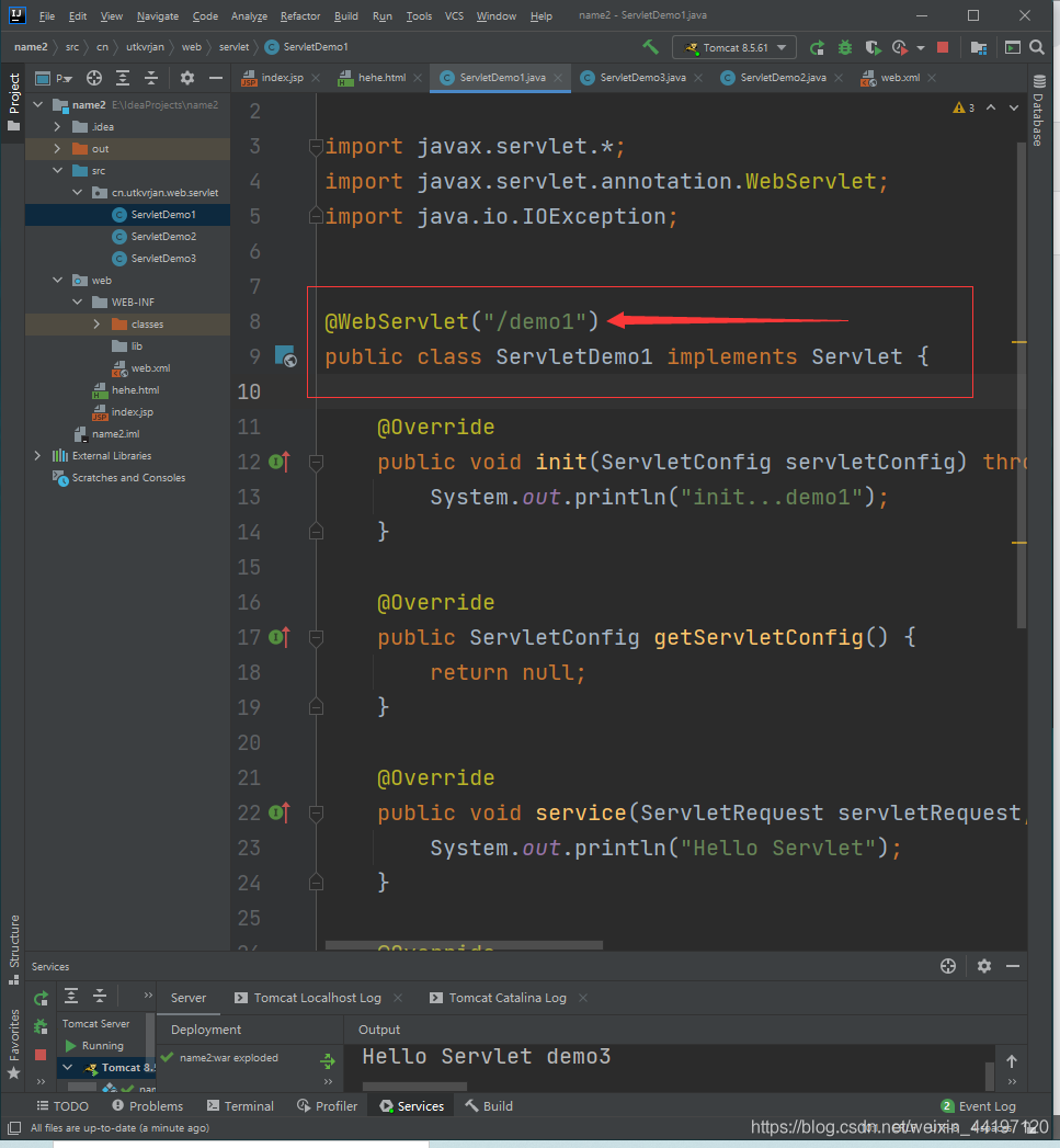 只需要在实现类类名上面写@webservlet(urlpatterns = "/demo1")或者@webservlet("/demo1")就能配置好啦