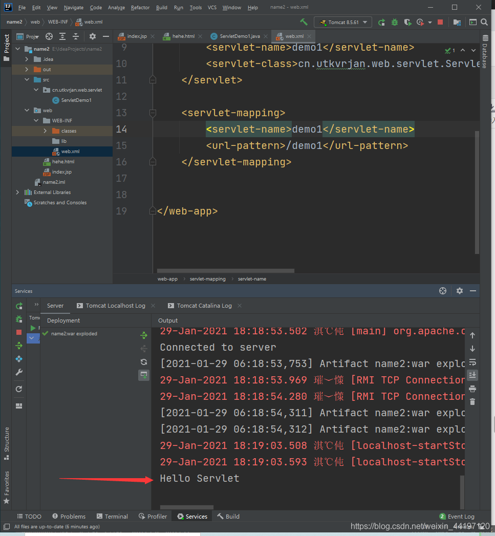 然后启动tomcat,并在浏览器输入localhost:8080/demo1访问(注:这里的demo1是在配置servlet时输入的),就能在idea的控制台输出你在servlet实现类的service方法下写的内容,就说明正确配置servlet。