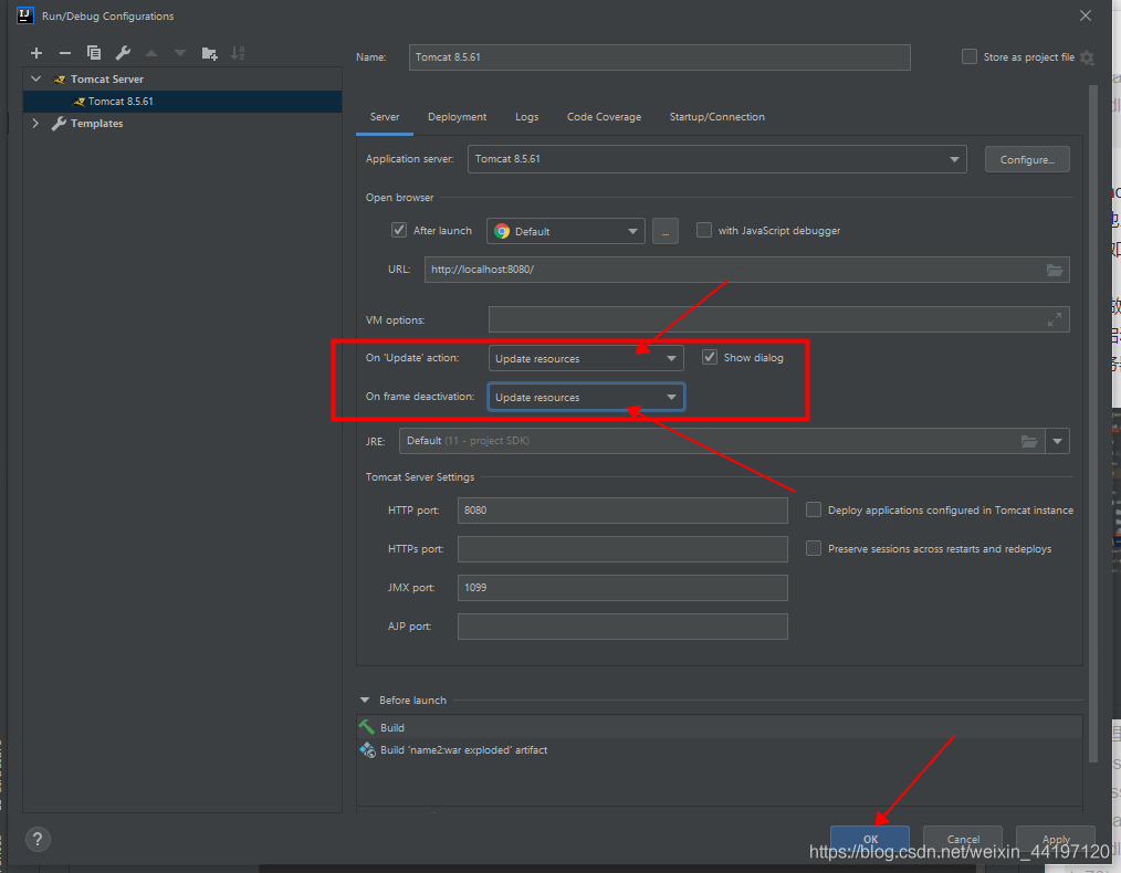 如果这里选择update resources and classes的话,当改java代码也会重新部署,因为java代码改得比较多,这样可能影响性能,所以不选了