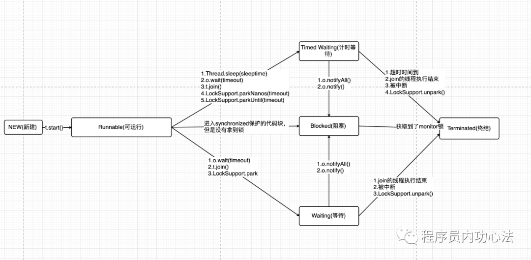 上图中可以看出处于Waiting、Time Waiting的线程调用notify()或者notifyAll()方法后,并不会进入Runnable状态而是进入Blocked状态,因为唤醒处于Waiting、Time Waiting状态的线程的线程在调用notify()或者notifyAll()时候,必须持有该monitor锁,所以处于Waiting、Time Waiting状态的线程被唤醒后,就会进入Blocked状态,直到执行了notify()\notifyAll()的线程释放了锁,被唤醒的线程才可以去抢夺这把锁,如果抢到了就从Blocked状态转换到Runnable状态