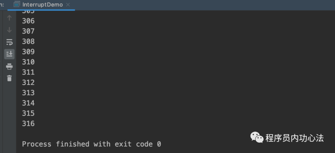 上图中通过循环打印0~999,但是实际运行并不会打印到999,因为在线程打印到999之前,我们对线程调用了interrupt方法使其中断了,然后根据while中的判断条件,方法提前终止,运行结果如下: