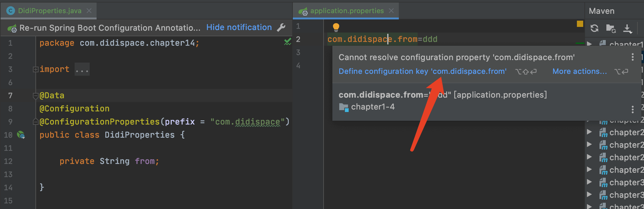 在使用spring boot开发应用的时候,你是否有发现这样的情况:自定义属性是有高量背景的,鼠标放上去,有一个cannot resolve configuration property的配置警告。