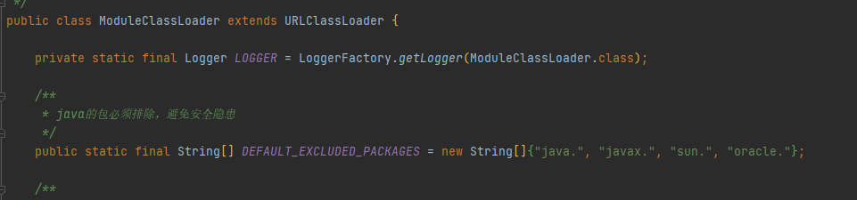 ModuleClassLoader是jarslink自定义的类加载器,继承自URLClassLoader,同时可以强制指定一些包下的class,由本ClassLoader自己加载,不通过父ClassLoader加载,突破双亲委派机制。