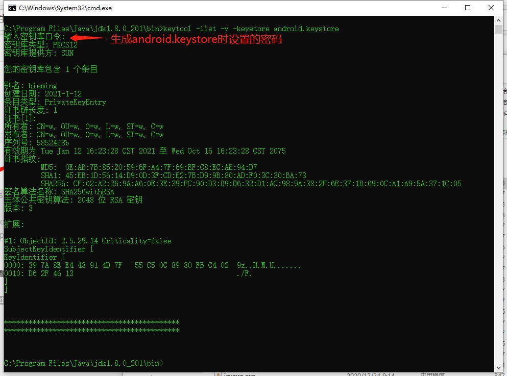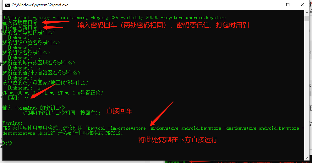 keytool -genkey -alias bieming -keyalg RSA -validity 20000 -keystore android.keystore