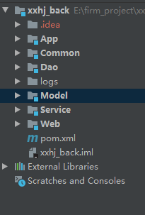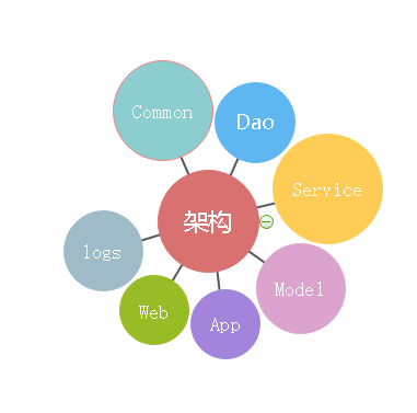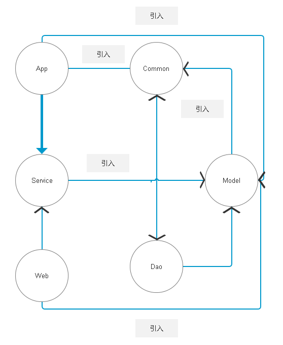 App(app请求接口全部在这里),Web(web请求接口全部在这里)、Dao(数据层)、Model(抽象数据层)、Service(业务层)、Common(所有通用工具在这里,任何模块接口访问)