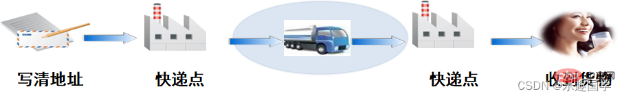 -->发件人将有收货人地址信息的货物送到快递站,发件人不用关心物流是如何进行的,货物被送到收货人所在地区的快递站点,进行配送,收货人等待收货就可以了。