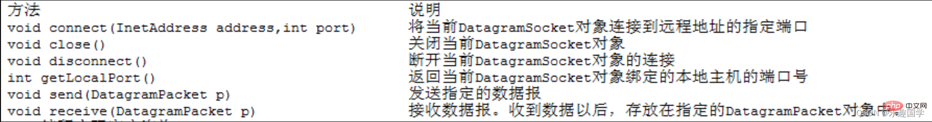 (6)DatagramPacket类不提供发送或接收数据的方法,而DatagramSocket类提供send()方法和receive()方法,用于通过套接字发送和接收数据报。