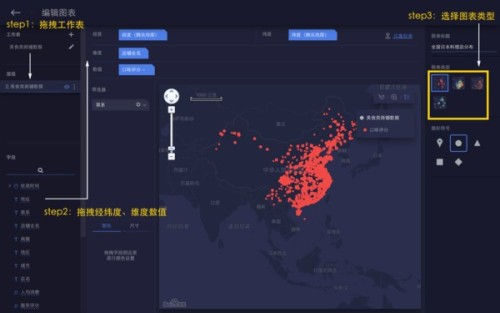 ? ? ? ?先拖拽工作表至图层,再拖拽经纬度、维度数值,然后选择想要的地图类型即可;