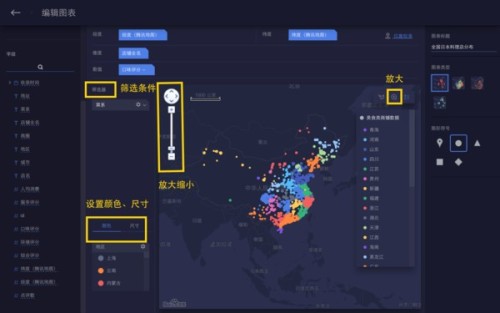 3、可设置颜色、尺寸,也可以对地图进行放大缩小(鼠标滑动也能放大缩小,不信可以试试),操作很简单;做完的数据地图也能通过链接分享给好友,也可以直接分享到各大社区,如朋友圈等。