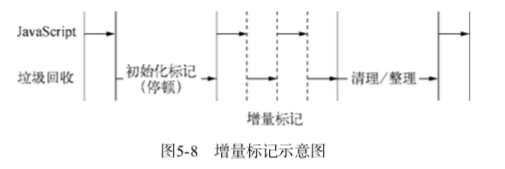 为了降低全堆垃圾回收带来的停顿时间,v8 先从标记阶段入手,将原本要一口气停顿完成的动作改成增量标记(incremental marking),也就是拆分为许多小“步进”,每做完一“步进”就让javascript应用逻辑执行一小会儿,垃圾回收和应用逻辑交替执行直到标记阶段完成。