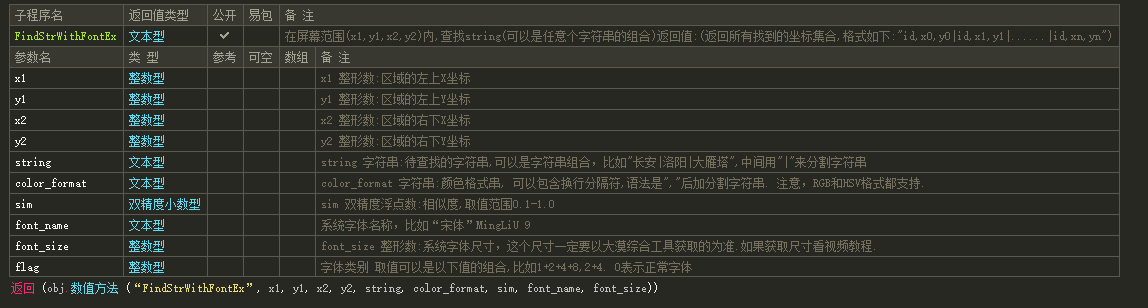 返回 (obj.数值方法 (“FindStrWithFontE”, x1, y1, x2, y2, string, color_format, sim, font_name, font_size))