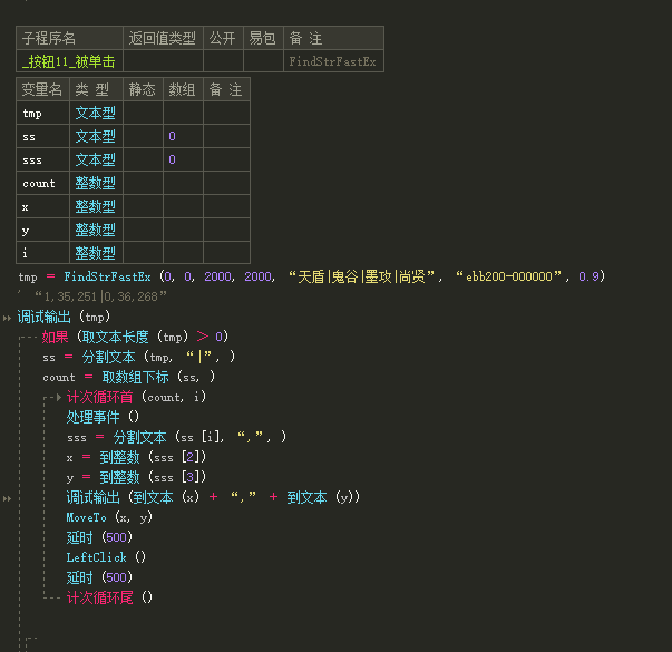 .子程序 FindStrWithFontE, 文本型, 公开, 在屏幕范围(x1,y1,x2,y2)内,查找string(可以是任意个字符串的组合)返回值:(返回字符串序号以及X和Y坐标,形式如"id|x|y", 比如"0|100|200",没找到时,id和X以及Y均为-1,"-1|-1|-1")