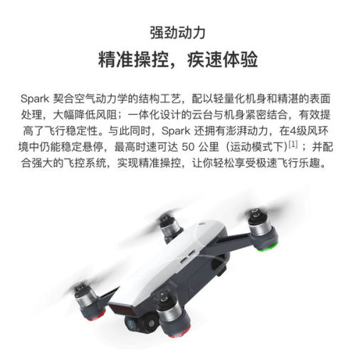 小身型,大身手。障碍感知结合机器视觉,操控易如反掌。机械云台配以 UltraSmooth,航拍稳定流畅。最高时速 50 公里1,2 公里高清图传2,手掌大小的 “晓” Spark,让你尽享飞行乐趣。