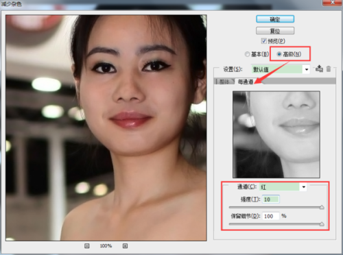 2、执行菜单栏“滤镜>杂色>减少杂色>高级>每通道”设置参数如下:? ?? ???红--强度10--保留细节100%绿--强度10--保留细节 6 %兰--强度10--保留细节 6 %